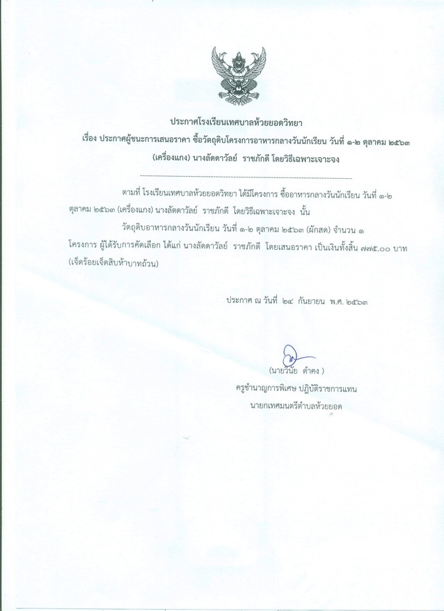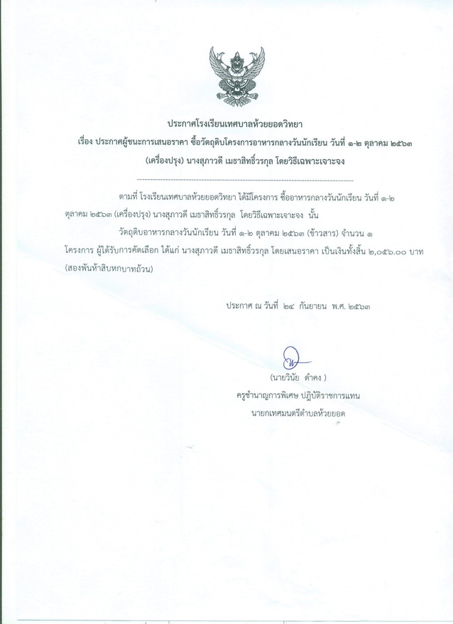 ประกาศผู้ชนะการเสนอราคา ซื้อวัตถุดิบโครงการอาหารกลางวันนักเรียน วันที่ 1-2 ต.ค. 63 (เครื่องแกง)