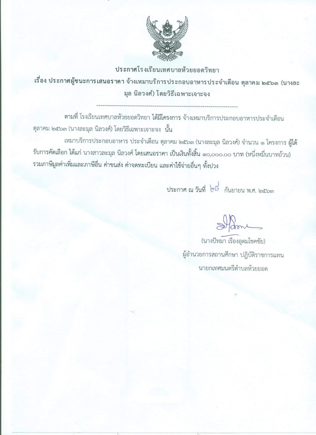 ประกาศผู้ชนะการเสนอราคา จ้างเหมาบริการประกอบอาหารประจำเดือน ตุลาคม 63