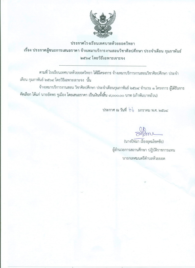 ประกาศผู้ชนะการเสนอราคา จ้างเหมาบริการงานสอนวิชาศิลปศึกษาเดือนกุมภาพันธ์ 2564