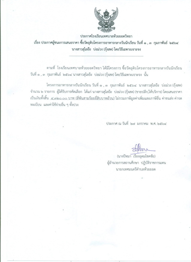 ประกาศผู้ชนะการเสนอราคา ซื้อวัตถุดิบโครงการอาหารกลางวันนักเรียน วันที่ 1 ก.พ. 64 (ขนมใส่ไส้)