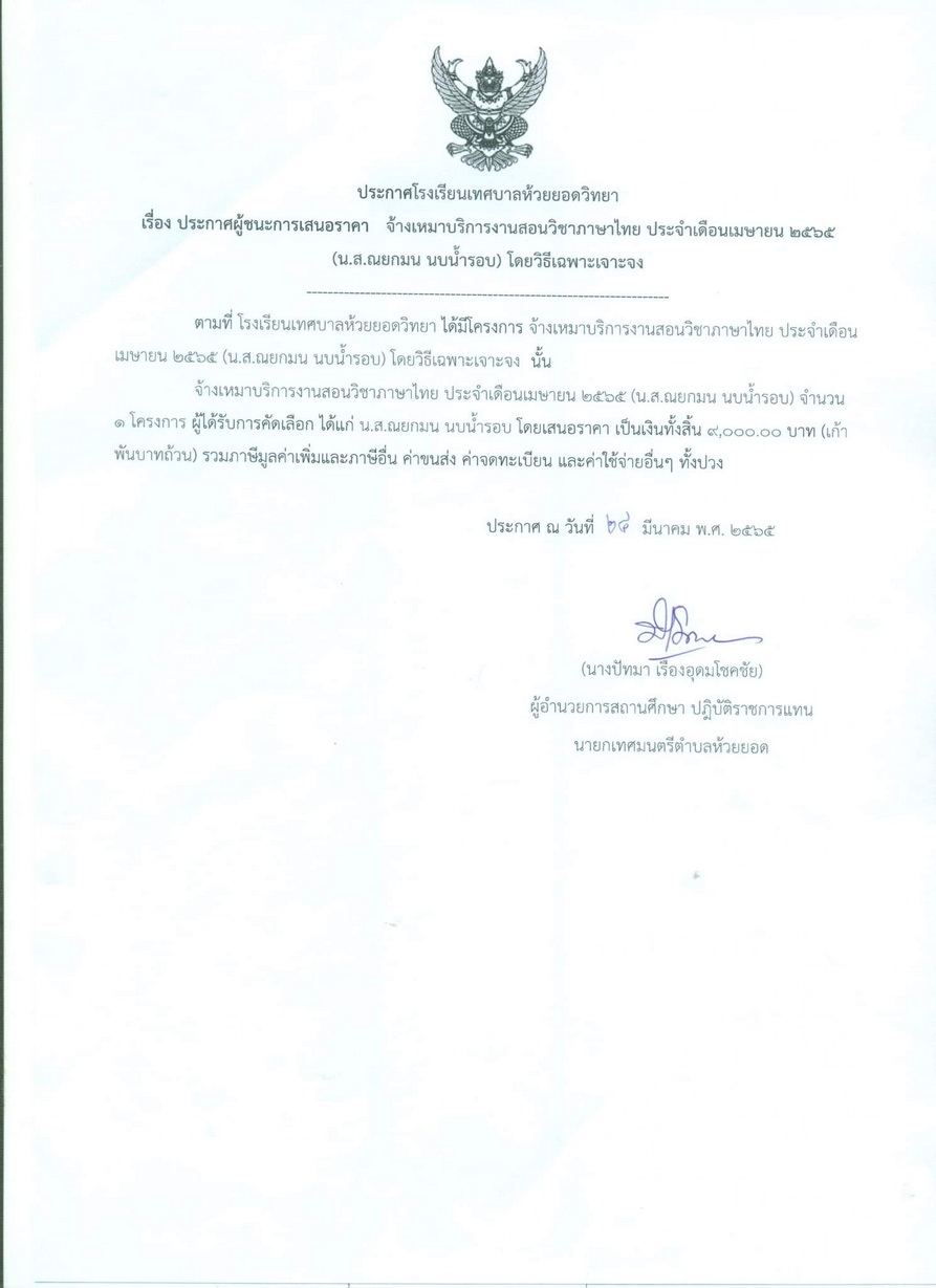 ประกาศผู้ชนะการเสนอราคา จ้างเหมาบริการงานสอนวิชาภาษาไทย ประจำเดือนเมษายน 2565