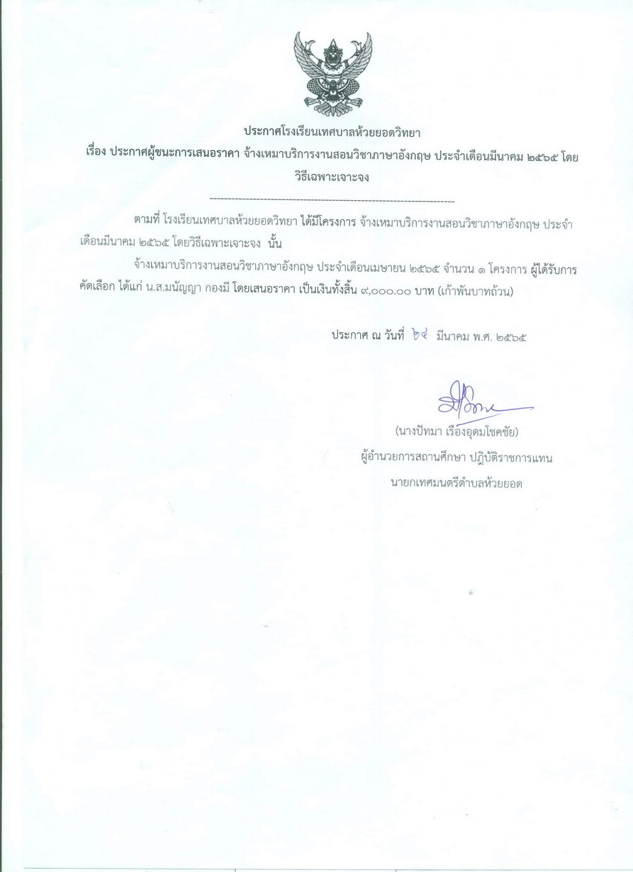 ประกาศผู้ชนะการเสนอราคา จ้างเหมาบริการงานสอนวิชาภาษาอังกฤษ ประจำเดือนมีนาคม 2565