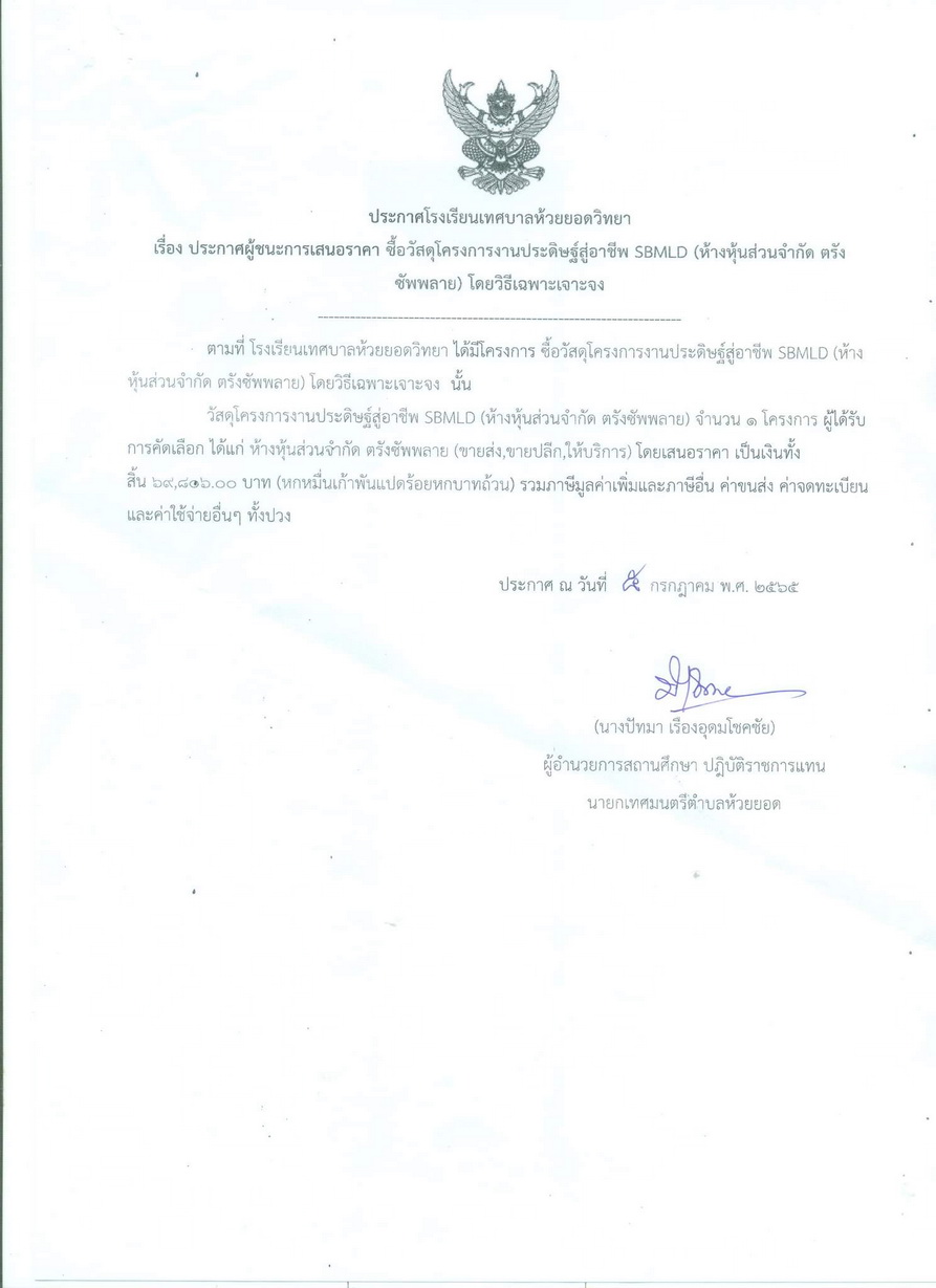 ประกาศผู้ชนะการเสนอราคา ซื้อวัสดุโครงการงานประดิษฐ์สู่อาชีพSBMLD