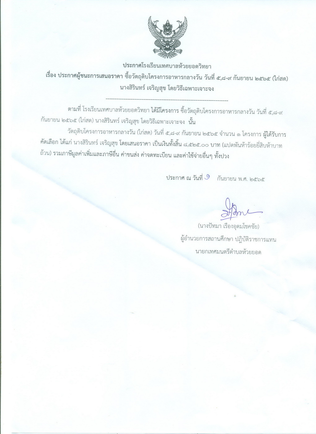 ประกาศผู้ชนะการเสนอราคา ซื้อวัตถุดิบโครงการอาหารกลางวันนักเรียนวันที่ 5,8-9 กันยายน 2565 (ไก่สด)