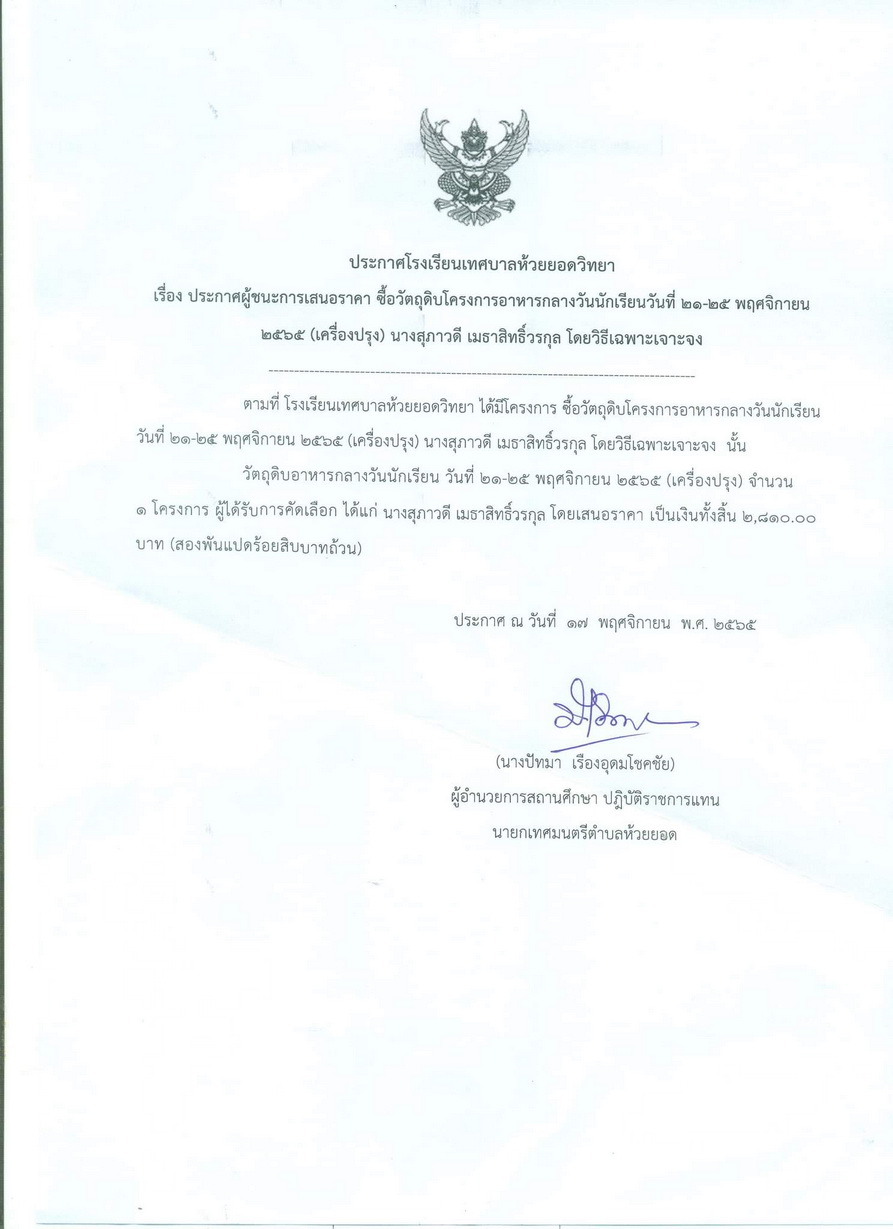 ประกาศผู้ชนะการเสนอราคา ซื้อวัตถุดิบโครงการอาหารกลางวันนักเรียนวันที่ 22-23 พฤศจิกายน 2565 (ผลไม้สด)