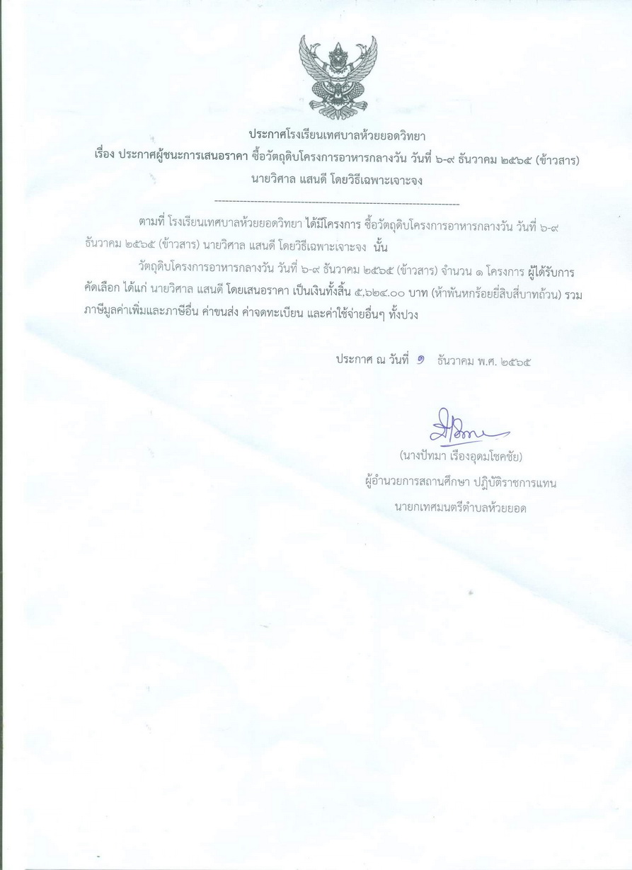 ประกาศผู้ชนะการเสนอราคา ซื้อวัตถุดิบโครงการอาหารกลางวันนักเรียนวันที่ 6-9 ธันวาคม 2565 (หมูสด)