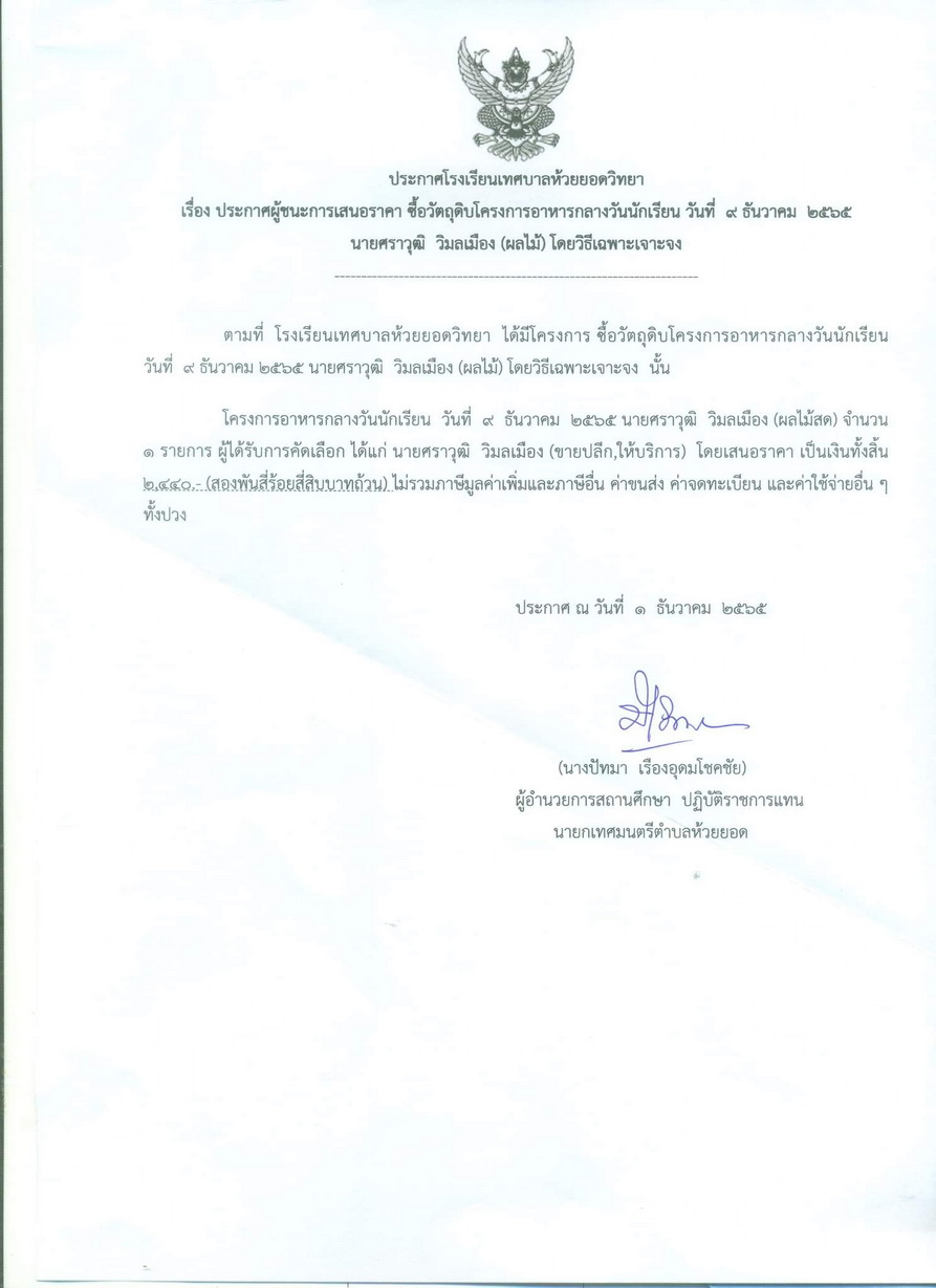 ประกาศผู้ชนะการเสนอราคา ซื้อวัตถุดิบโครงการอาหารกลางวันนักเรียนวันที่ 9 ธันวาคม 2565 (ผลไม้)