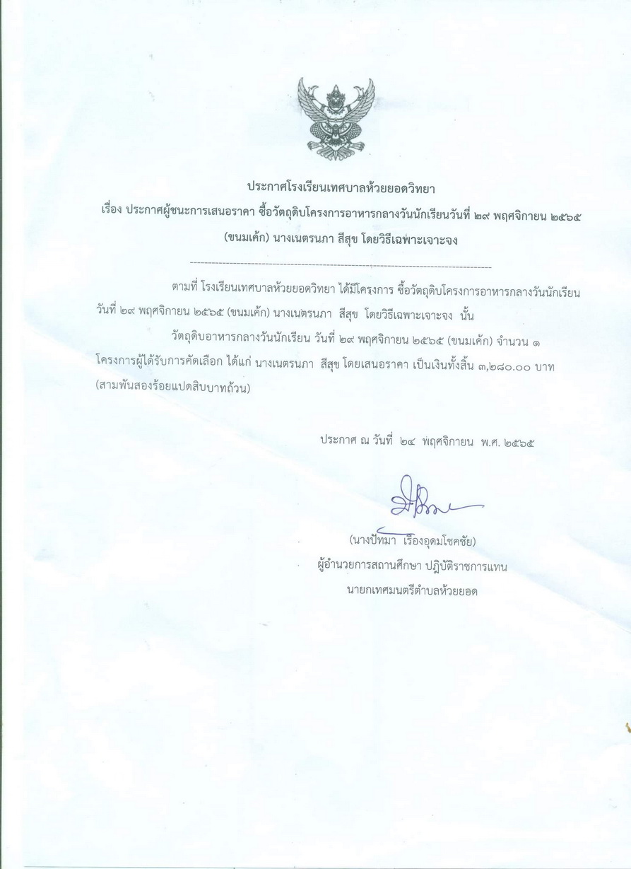 ประกาศผู้ชนะการเสนอราคา ซื้อวัตถุดิบโครงการอาหารกลางวันนักเรียนวันที่ 29 พฤศจิกายน 2565 (ขนมเค้ก)