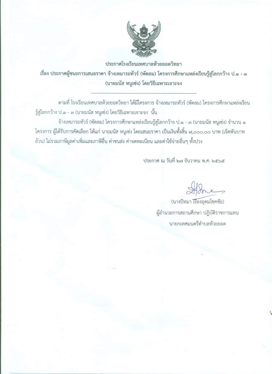 ประกาศผู้ชนะการเสนอราคา วัสดุโครงการศึกษาแหล่งเรียนรู้สู่โลกกว้าง ป.1-3