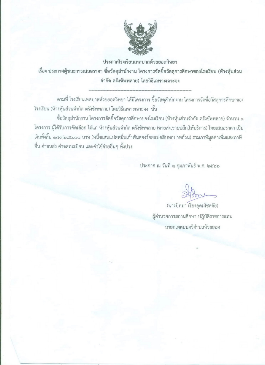 ประกาศผู้ชนะการเสนอราคา ซื้อวัสดุสำนักงาน โครงการจัดซื้อวัสดุการศึกษาของโรงเรียน