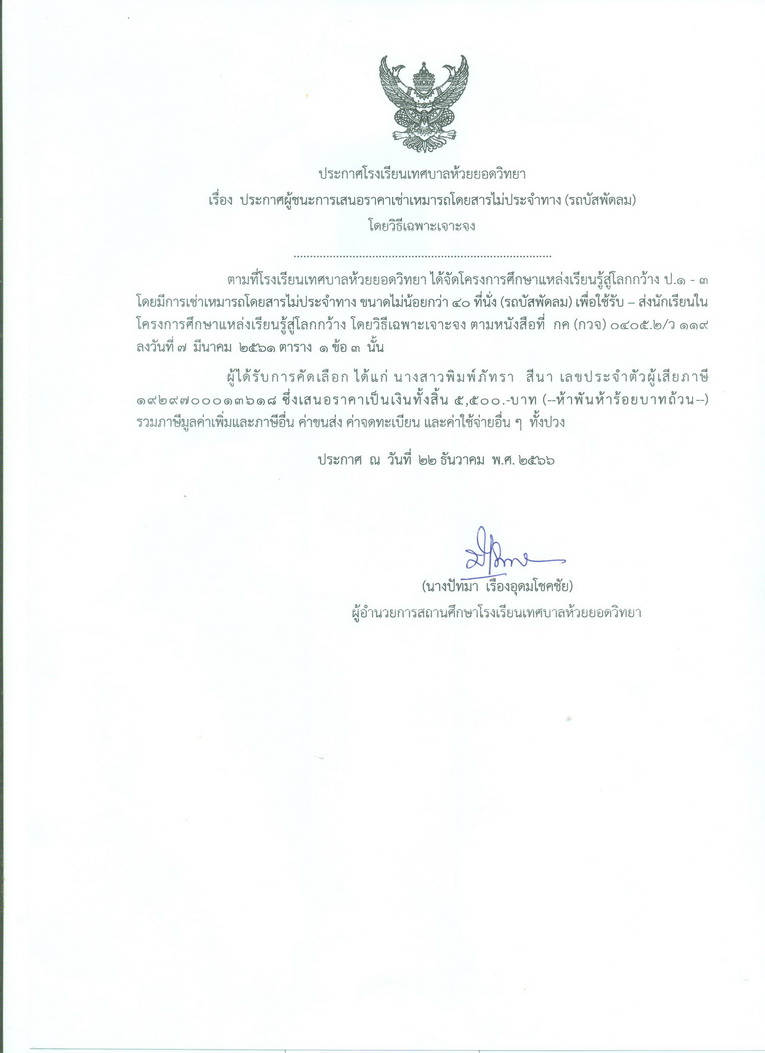 ประกาศโรงเรียนเทศบาลห้วยยอดวิทยา รายละเอียด เผยแพร่เมื่อ: วันพุธ, 31 มกราคม 2567 12:21 ก่อนหน้า ต่อไป
