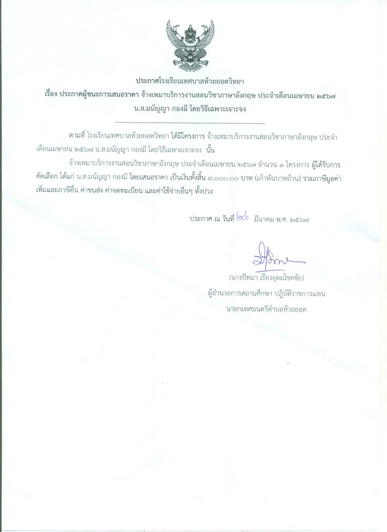 ประกาศโรงเรียนเทศบาลห้วยยอดวิทยา รายละเอียด เผยแพร่เมื่อ: วันพฤหัสบดี, 11 เมษายน 2567 12:19 ก่อนหน้า ต่อไป