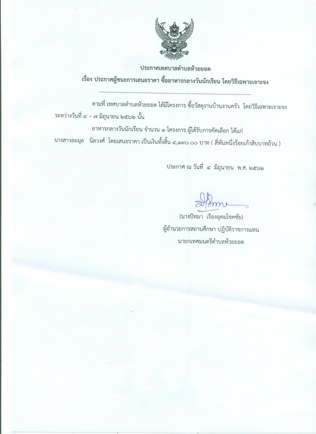 ประกาศเทศบาลตำบลห้วยยอด เรื่อง ประกาศผู้ชนะการเสนอราคา