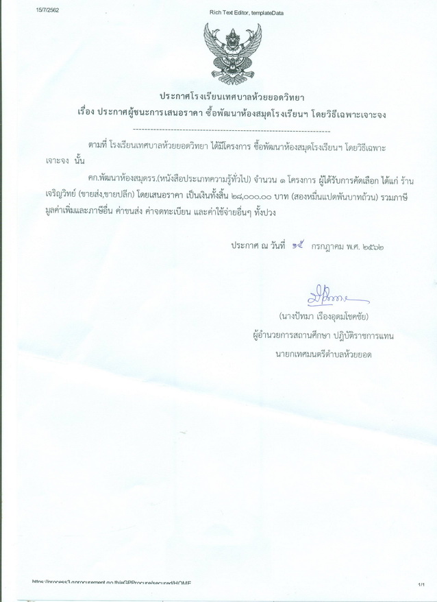 ประกาศผู้ชนะการเสนอราคา ซื้อพัฒนาห้องสมุดโรงเรียนฯ