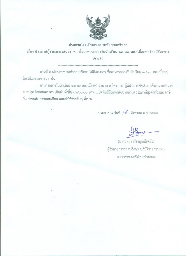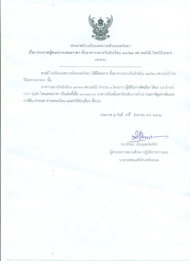 ประกาศผู้ชนะการเสนอราคา ซื้ออาหารกลางวันนักเรียน วันที่ 19-23 สิงหาคม 2562 (ผลไม้)