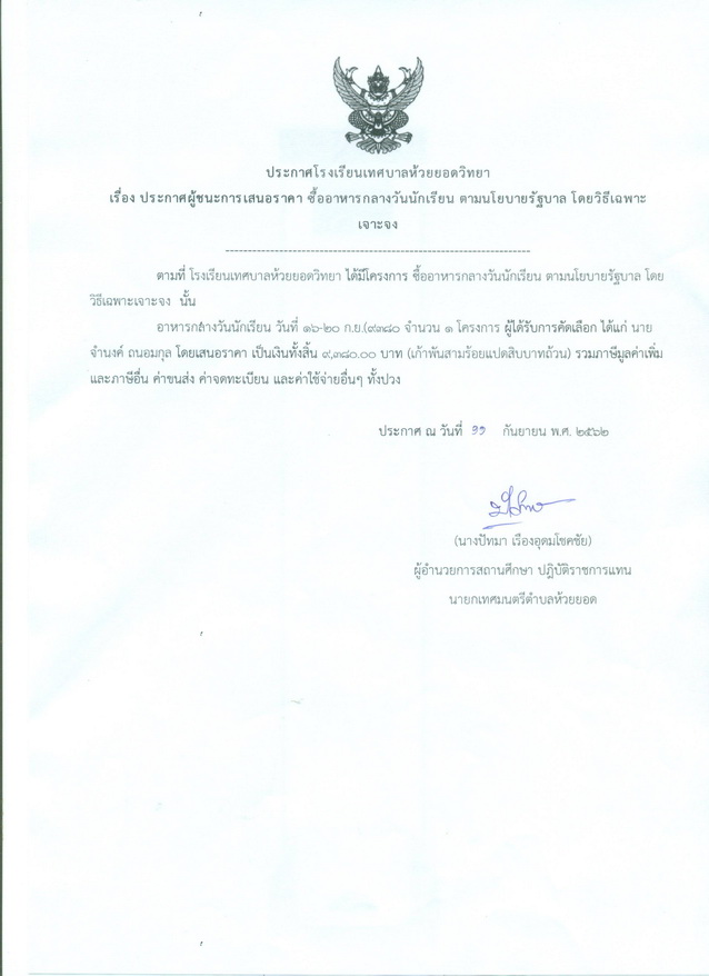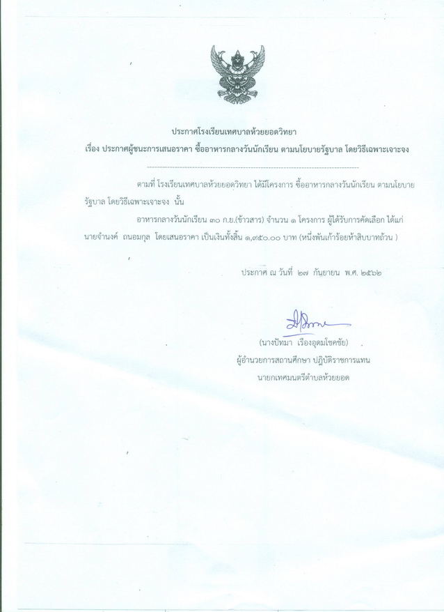 ประกาศผู้ชนะการเสนอราคา ซื้ออาหารกลางวันนักเรียน