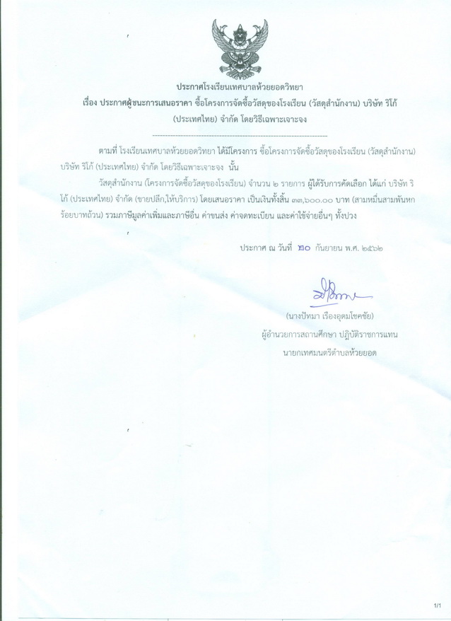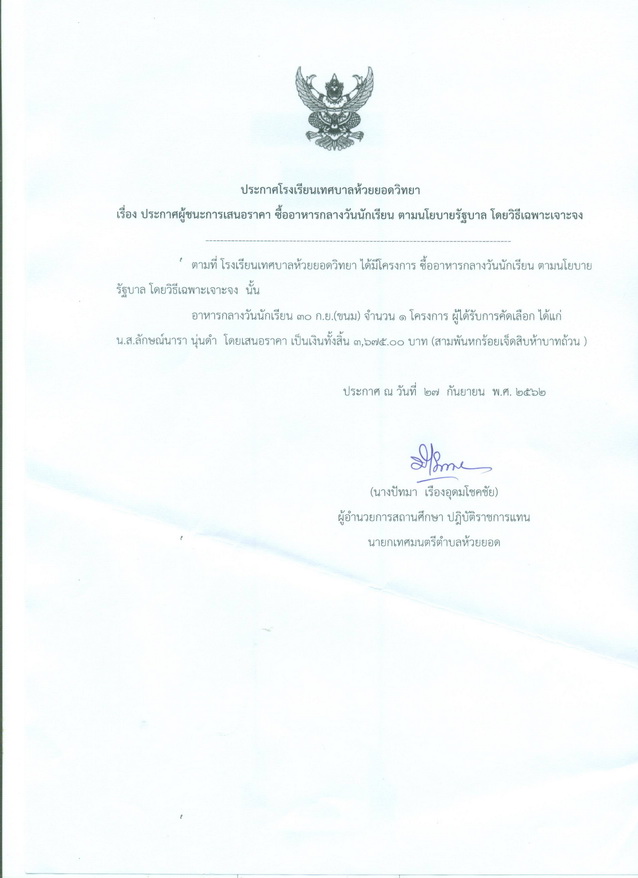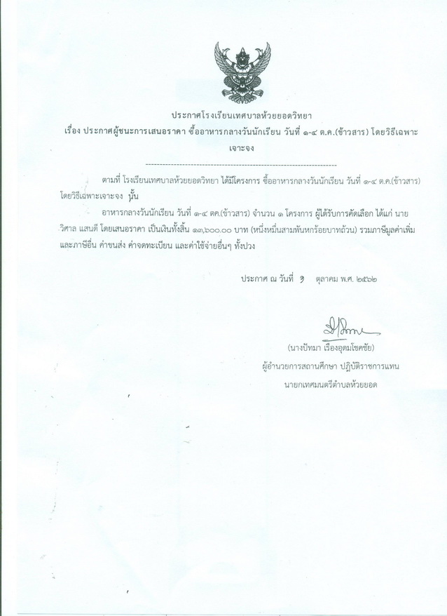 ประกาศผู้ชนะการเสนอราคา ซื้ออาหารกลางวันนักเรียน วันที่ 1-4 ตุลาคม 2562 (ผลไม้)