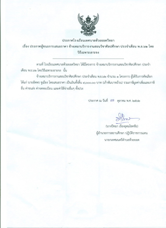 ประกาศผู้ชนะการเสนอราคา จ้างเหมาบริการงานสอนวิชาศิลปศึกษา ประจำเดือนพฤศจิกายน 2562
