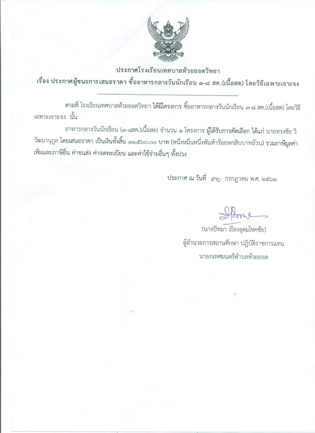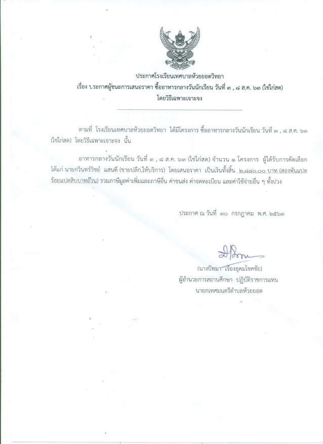 ประกาศผู้ชนะการเสนอราคา ซื้ออาหารกลางวันนักเรียน วันที่3,8 ส.ค. 63 (ไข่ไก่สด)