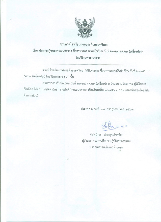 ประกาศผู้ชนะการเสนอราคา ซื้ออาหารกลางวันนักเรียน วันที่20,25 ก.ค. 63 (ไข่ไก่สด)