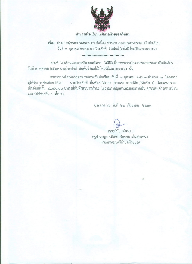 ประกาศผู้ชนะการเสนอราคา ซื้อวัตถุดิบโครงการอาหารกลางวันนักเรียน วันที่ 1 ต.ค. 63 (ผลไม้)