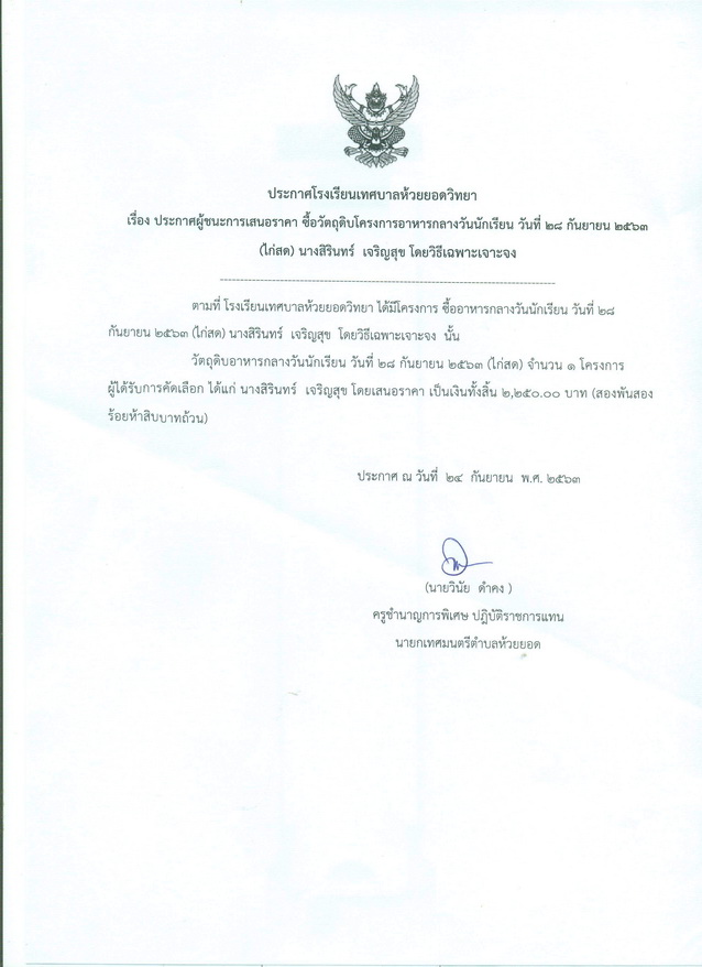 ประกาศผู้ชนะการเสนอราคา ซื้อวัตถุดิบโครงการอาหารกลางวันนักเรียน วันที่ 28 ก.ย. 63 (ไก่สด)