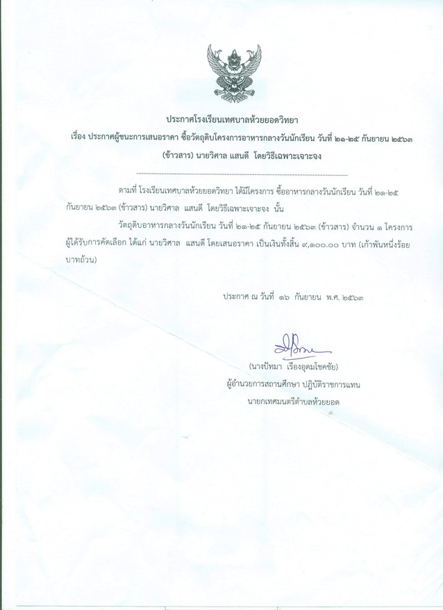 ประกาศผู้ชนะการเสนอราคา ซื้อวัตถุดิบโครงการอาหารกลางวันนักเรียน วันที่ 21-25 ก.ย. 63 (ข้าวสาร)