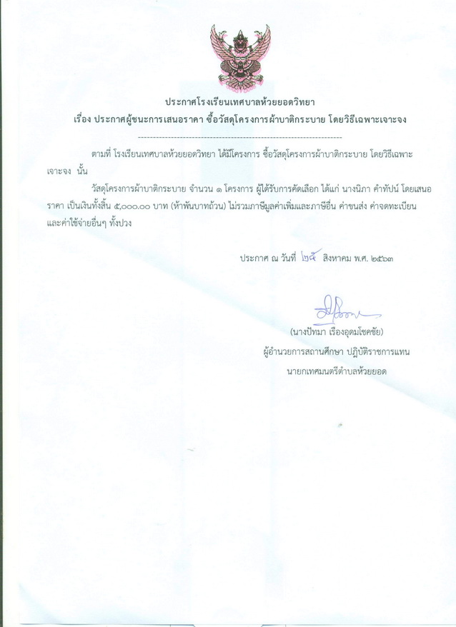 ประกาศเทศบาลตำบลห้วยยอด เรื่อง ประกาศผู้ชนะการเสนอราคา