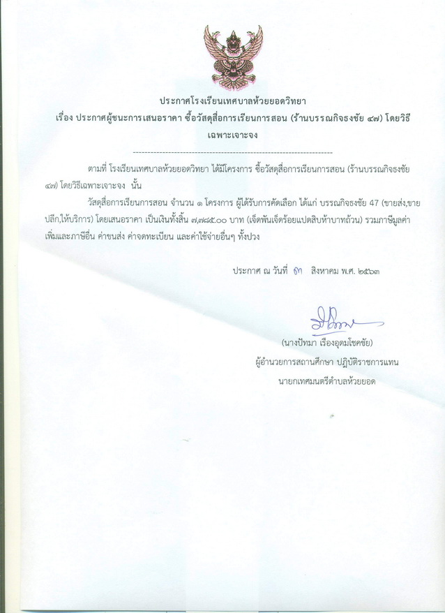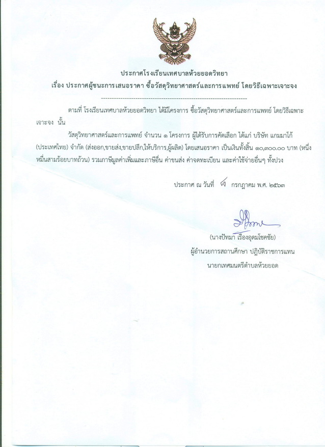 ประกาศเทศบาลตำบลห้วยยอด เรื่อง ประกาศผู้ชนะการเสนอราคา