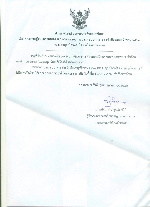 ประกาศผู้ชนะการเสนอราคา จ้างเหมาบริการงานวิชาศิลปศึกษาประจำเดือน พฤศจิกายน 63