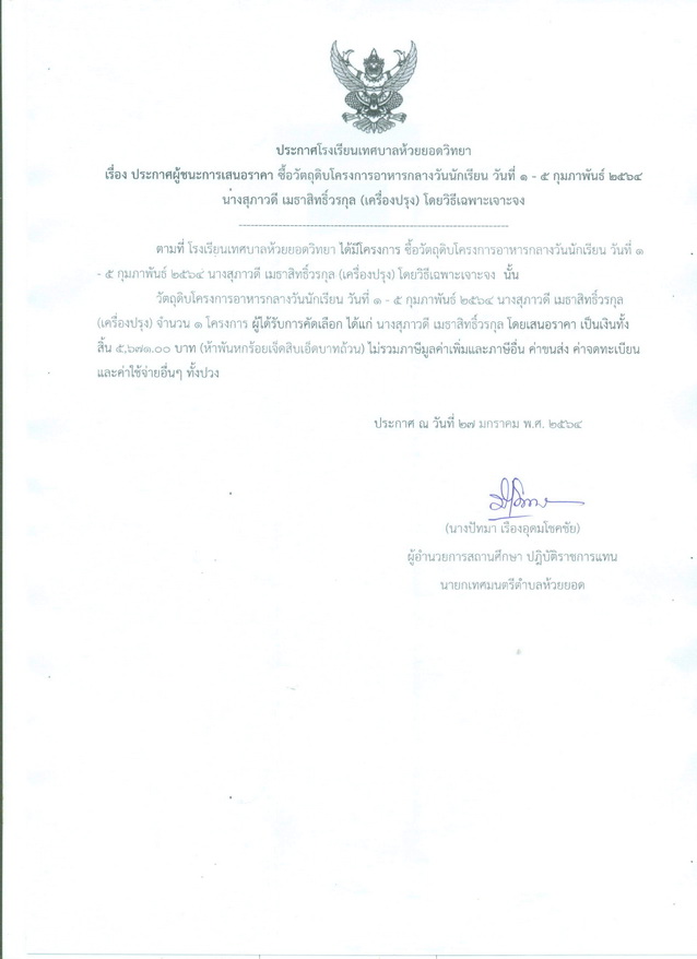 ประกาศผู้ชนะการเสนอราคา ซื้อวัตถุดิบโครงการอาหารกลางวันนักเรียน วันที่ 1-5 ก.พ. 64 (เครื่องแกง)