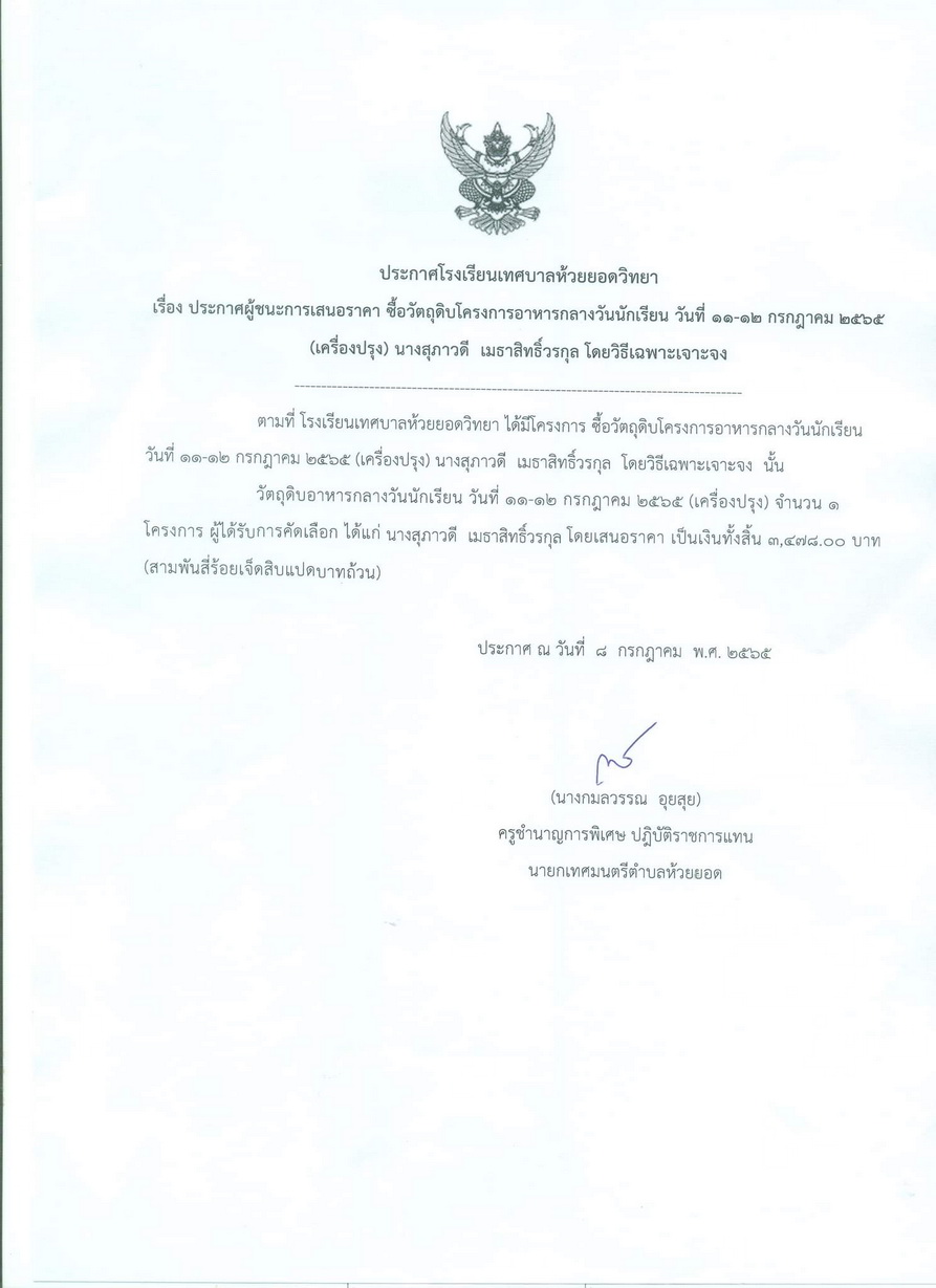 ประกาศผู้ชนะการเสนอราคา ซื้อวัตถุดิบโครงการอาหารกลางวันนักเรียนวันที่ 26 กรกฏาคม 2565 (ผลไม้สด)