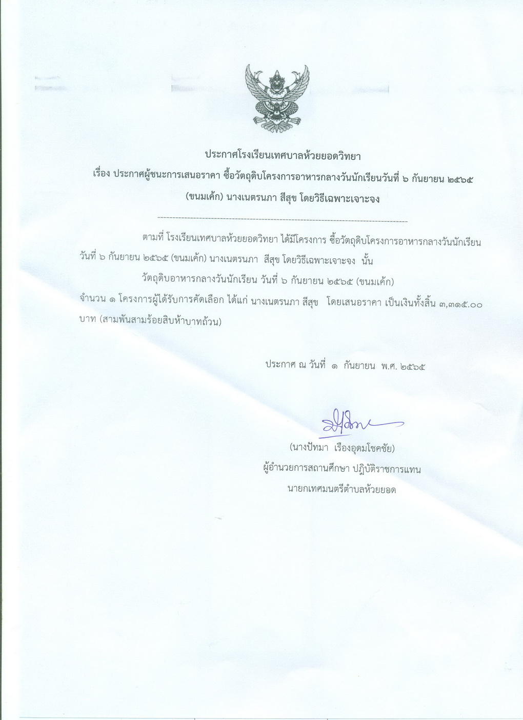 ประกาศผู้ชนะการเสนอราคา ซื้อวัตถุดิบโครงการอาหารกลางวันนักเรียนวันที่ 6 กันยายน 2565 (ขนมเค้ก)