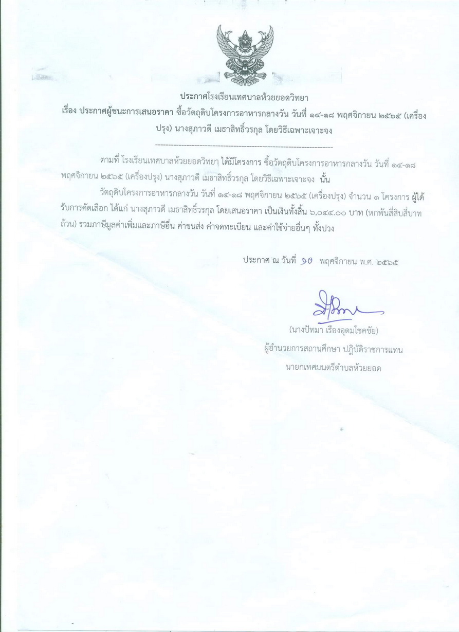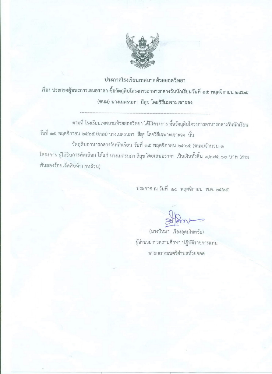 ประกาศผู้ชนะการเสนอราคา ซื้อวัตถุดิบโครงการอาหารกลางวันนักเรียนวันที่ 15,17 พฤศจิกายน 2565 (ผลไม้)