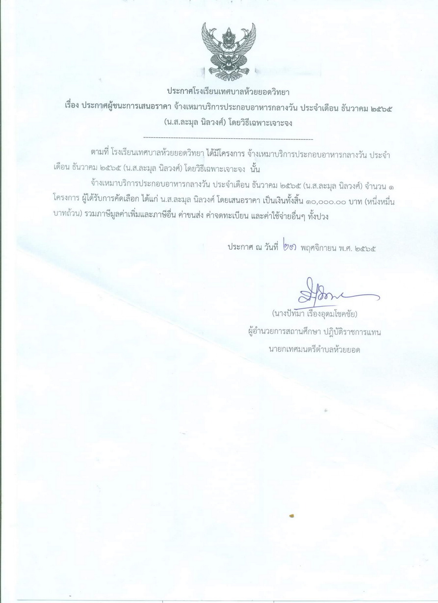 ประกาศผู้ชนะการเสนอราคา จ้างเหมาบริการประกอบอาหารกลางวัน ประจำเดือนธันวาคม 2565