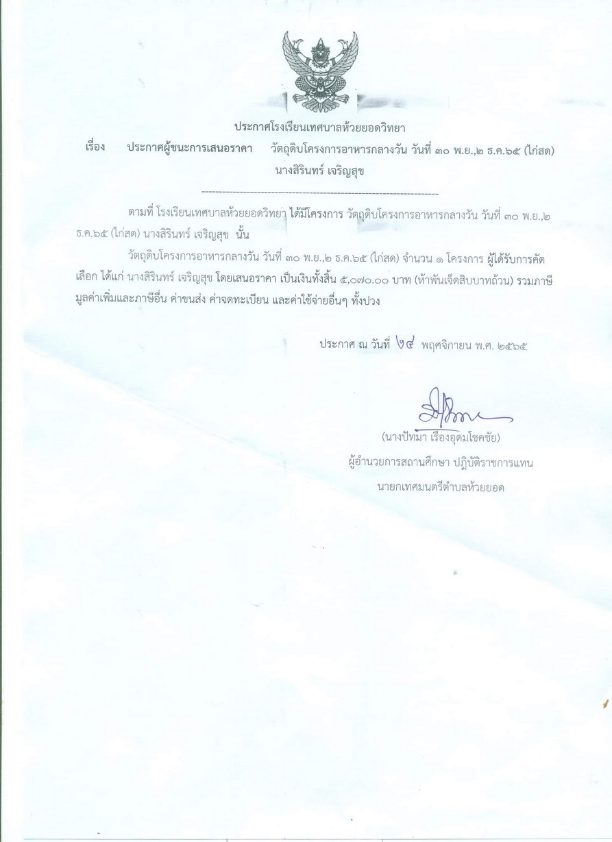 ประกาศผู้ชนะการเสนอราคา ซื้อวัตถุดิบโครงการอาหารกลางวันนักเรียนวันที่ 1-2 ธันวาคม 2565 (ไข่ไก่)