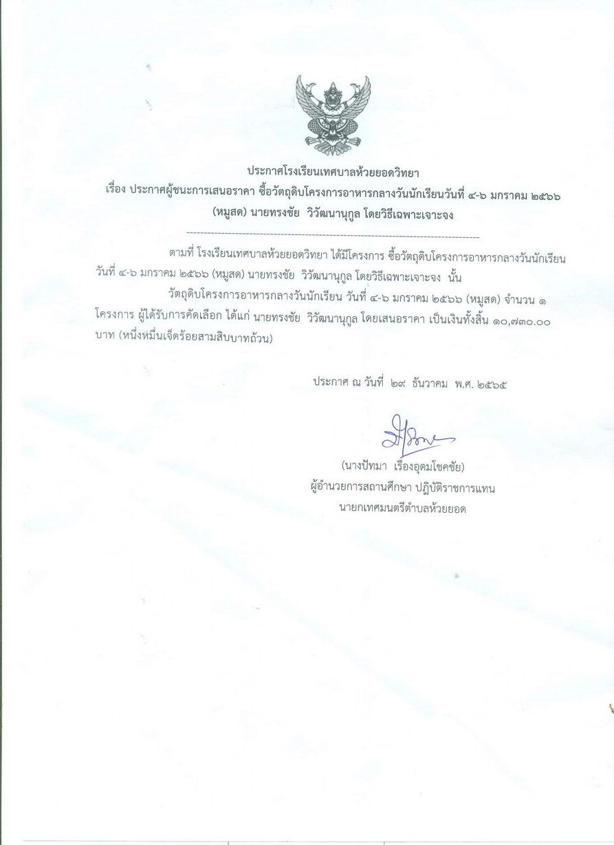 ประกาศผู้ชนะการเสนอราคา ซื้อวัตถุดิบโครงการอาหารกลางวันนักเรียนวันที่ 6 มกราคม 2566 (ผลไม้สด)