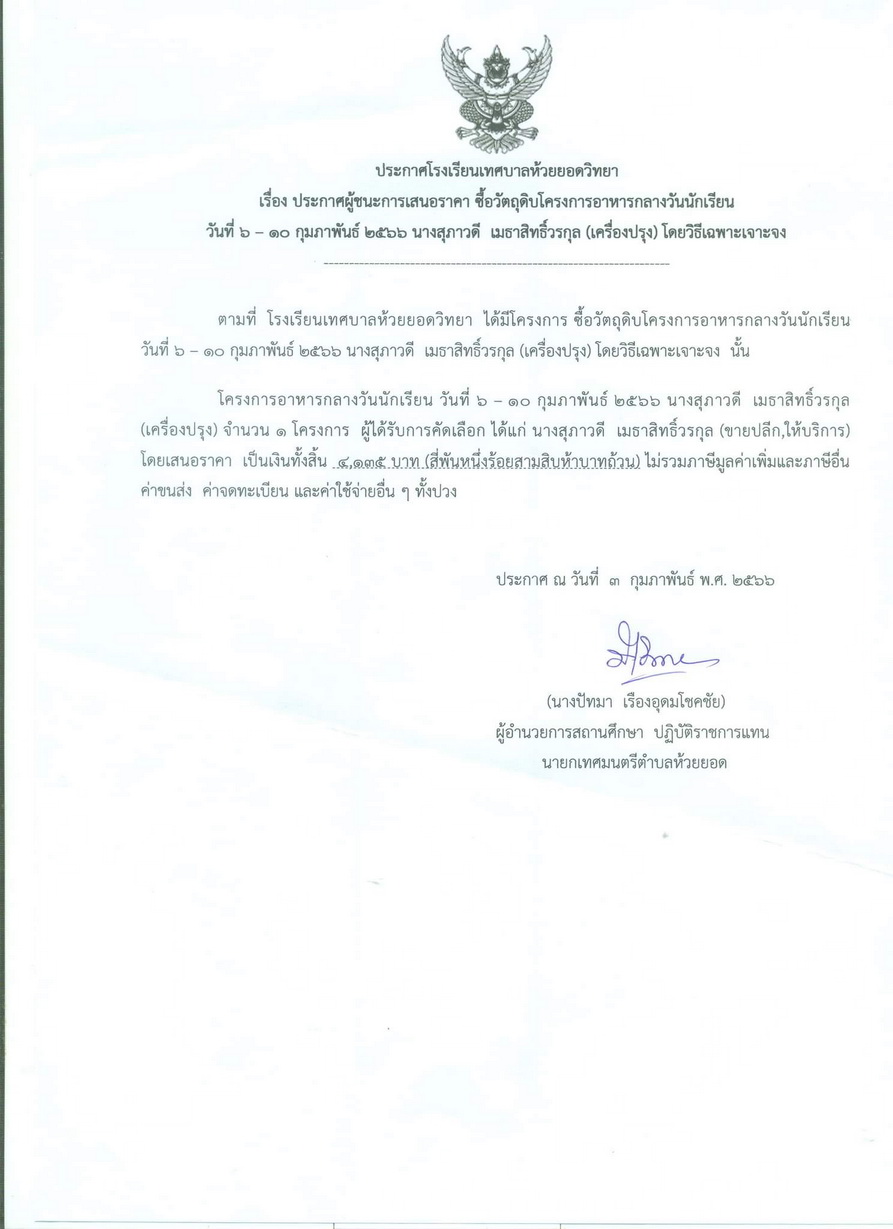 ประกาศผู้ชนะการเสนอราคา ซื้อวัตถุดิบโครงการอาหารกลางวันนักเรียนวันที่ 6-7,9 กุมภาพันธ์ 2566 (ผลไม้)