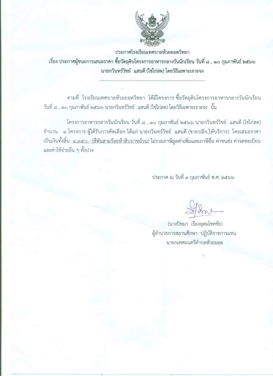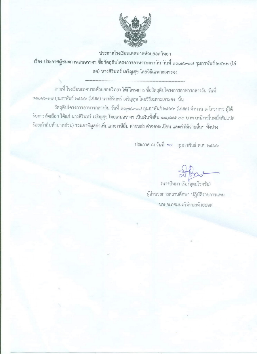 ประกาศผู้ชนะการเสนอราคา ซื้อวัตถุดิบโครงการอาหารกลางวันนักเรียนวันที่ 6-8 กุมภาพันธ์ 2566 (ไก่สด)