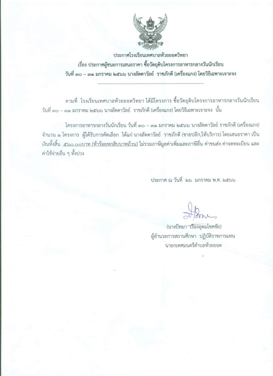 ประกาศผู้ชนะการเสนอราคา ซื้อวัตถุดิบโครงการอาหารกลางวันนักเรียนวันที่ 30-31 มกราคม 2566 (ไข่ไก่สด)
