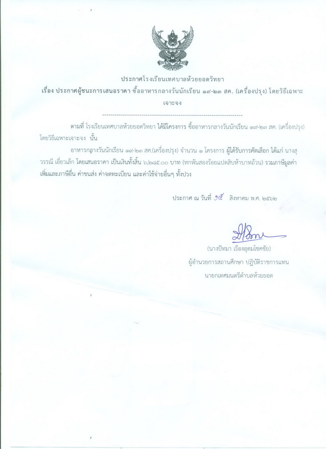 ประกาศผู้ชนะการเสนอราคา ซื้ออาหารกลางวันนักเรียน วันที่ 19-23 สิงหาคม 2562 (เครื่องปรุง)