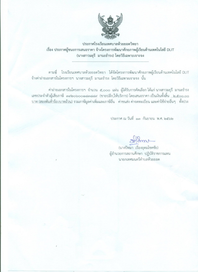 ประกาศผู้ชนะการเสนอราคา จ้างโครงการพัฒนาศักยภาพผู้เรียนด้านเทคโนโลยี DLIT (นางสาวมยุรี มานะธำรง)