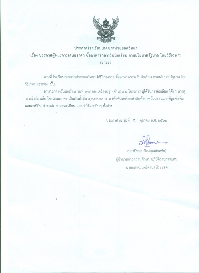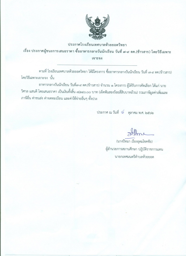 ประกาศผู้ชนะการเสนอราคา ซื้ออาหารกลางวันนักเรียน วันที่ 7-9 ตุลาคม 2562 (ขนม,ผลไม้)