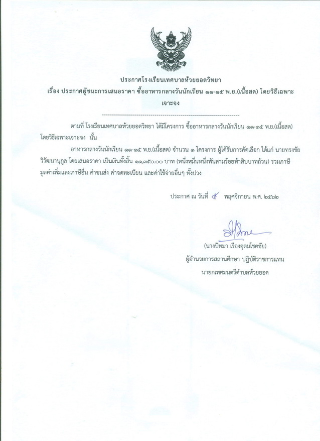 ประกาศผู้ชนะการเสนอราคา ซื้ออาหารกลางวันนักเรียน วันที่ 31 ตุลาคม - 1 พฤศจิกายน 2562