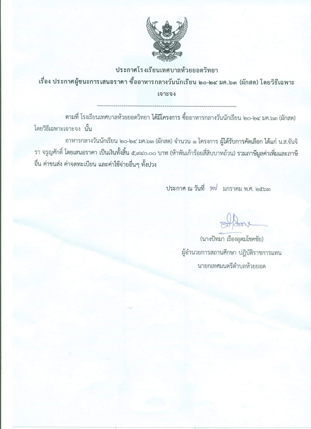 ประกาศผู้ชนะการเสนอราคา ซื้ออาหารกลางวันนักเรียน 23-24 ม.ค. 2563 (ผลไม้)