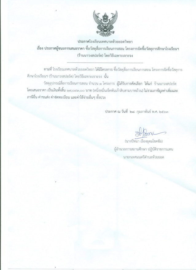 ประกาศผู้ชนะการเสนอราคา ซื้อวัสดุสื่อการเรียนการสอน โครงการจัดซื้อวัสดุของโรงเรียน